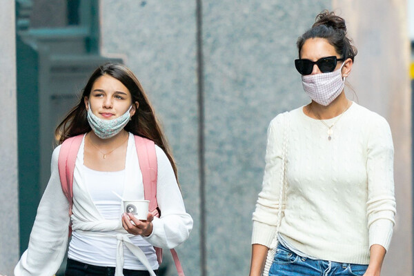 18-летняя дочь актеров прогулялась по Нью-Йорку вместе с матерью. Она предпочла джинсы на низкой посадке, футболку и куртку. Образ завершили коричневые «биркенштоки». Волосы она уложила в пучок и отказалась от макияжа. Кэти Холмс позировала в тренче, свитере с высоким горлом и джинсах-клеш.