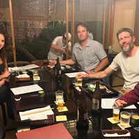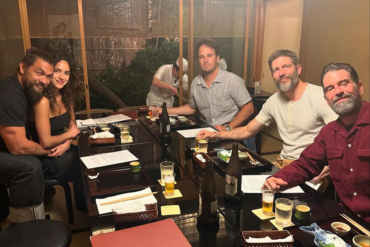 На одном из кадров 44-летний Джейсон Момоа обнимал 32-летнюю Адрию Архону. Знаменитости были запечатлены в кафе. Они сидели за столом с друзьями и улыбались фотографу. Актер позировал в черной футболке и брюках, а девушка — в облегающем платье.