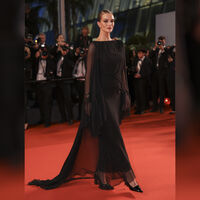 Модель Рози Хантингтон-Уайтли предпочла для выхода летящее черное платье с прозрачными рукавами и открытой спиной. Ей также сделали укладку с низким пучком и вечерний макияж.