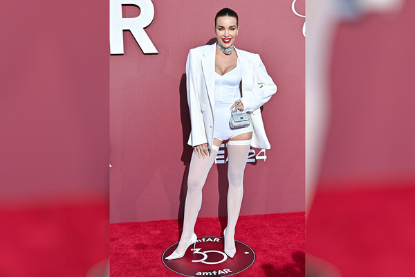 Модель позировала в корсетном боди, трусах с завышенной линией талии и жакете с мужского плеча. Образ дополнили чулки в тон, блестящая сумка и полупрозрачные туфли на каблуках. Дарья Коновалова также сделала укладку с гладким пучком и макияж с красной помадой.