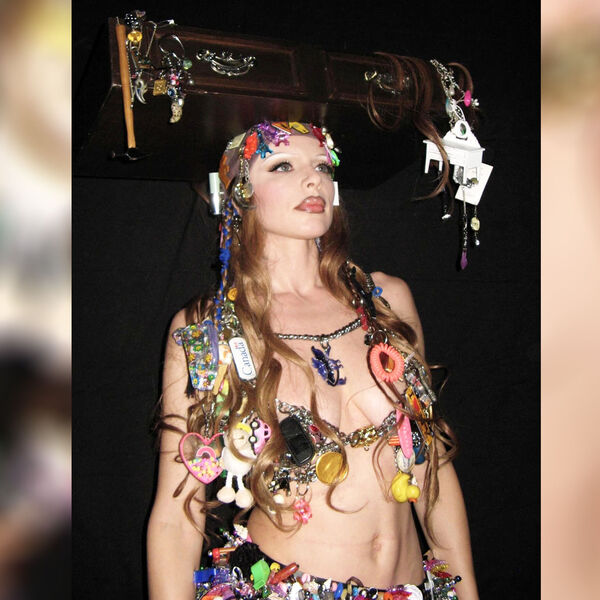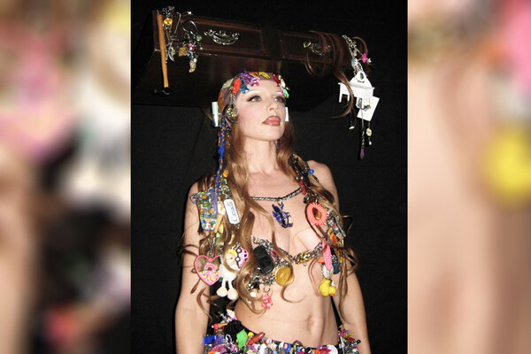 Модель Джулия Фокс позировала без белья с детскими брелоками, резинками для волос и бейджами вместо одежды. На голову она надела ящик, который был наполнен аксессуарами. Образ дополнили белые остроносые сапоги и массивное колье.