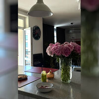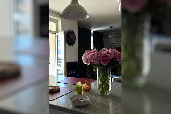 Виктория Антонова показала фрагмент кухни-гостиной с балконом и панорамными окнами. В центре композиции был «остров», на котором стояла ваза с пионами, а также посуда для завтрака и свечи в стеклянной посуде. На фоне можно увидеть две картины и акцентные светильники.