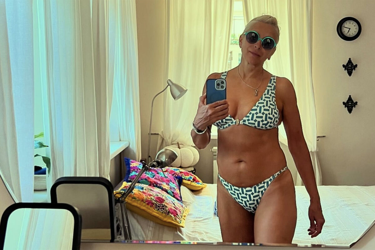 61-летняя Алена Свиридова показала фигуру в крошечном пестром бикини. Образ дополнили солнцезащитные очки с круглой голубой оправой. Волосы она собрала и предпочла остаться без макияжа. Фотографию она сделала в зеркале во время отдыха в Сочи.