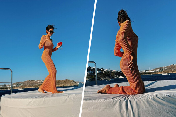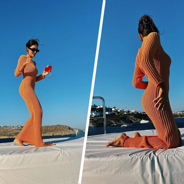 Ханде Эрчел позировала в «голом» оранжевом платье. Образ дополнили акцентные цветные серьги и солнцезащитные очки. В руках она держала бокал коктейля. Съемка прошла на яхте у острова Миконос. Поклонники отметили, что актриса «сильно похудела».