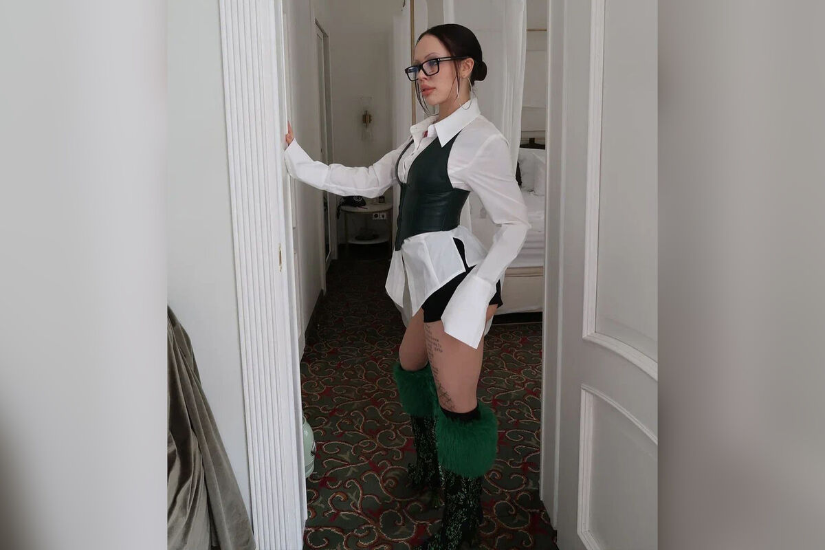 24-летняя Инстасамка позировала в белой рубашке, черных ультракоротких шортах, кожаном жилете и темных сапогах с зеленым мехом. Рэперша также надела массивные серьги-кольца и очки в черной оправе. Исполнительница сделала пучок с прядями у лица и нюдовый макияж.