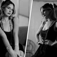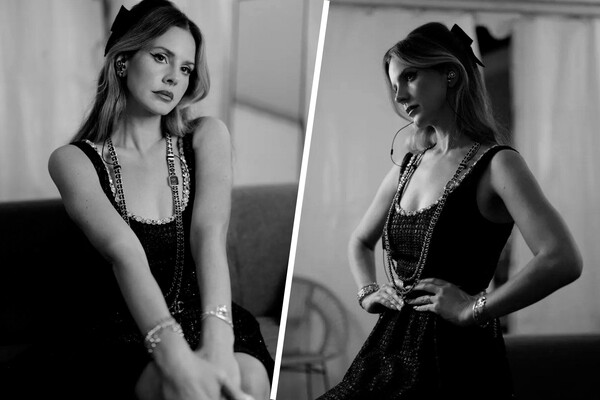 Лана Дель Рей позировала в черном мини-платье с глубоким декольте. Образ дополнило ожерелье-наушники с часами — новинка ювелирного сектора бренда. Ей также сделали укладку, собрав пряди на макушке, и завершили все ярким вечерним макияжем со стрелками. В видеоролике о новинке снялась дочь Джонни Деппа Лили-Роуз Депп.