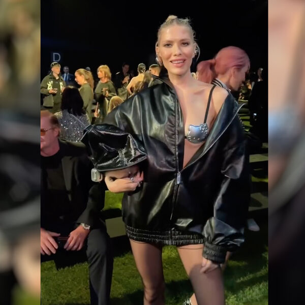 Модель Лена Перминова позировала в кожаной мини-юбке и бомбере. Образ дополнил серебряный лифчик в форме кошек Hello Kitty. Ей также сделали укладку с высоким пучком и вечерний макияж.