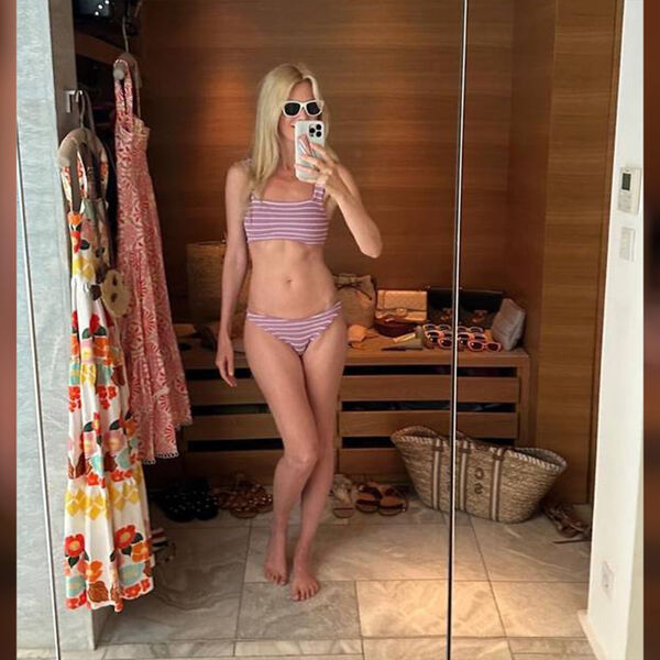 54-летняя Клаудия Шиффер позировала в полосатом купальнике перед зеркалом. Волосы она распустила и сделала легкий макияж. Образ дополнили солнцезащитные очки.