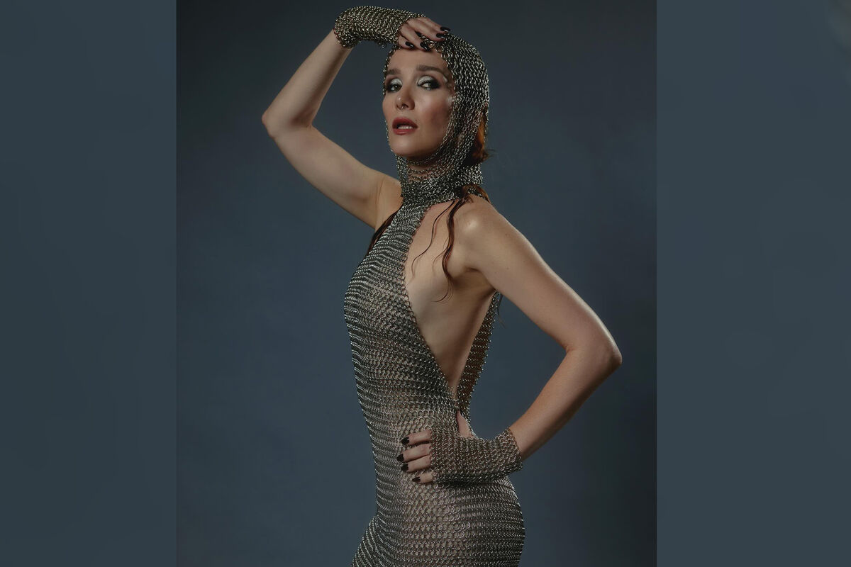 47-летняя Наталия Орейро позировала в серебристом платье-кольчуге, под которое не стала надевать бюстгальтер. Актриса также надела головной убор и митенки в стиле наряда. Знаменитость дополнила образ блестящими босоножками на каблуках. Певице уложили волосы и сделали макияж с темными сияющими тенями и темно-розовой помадой.