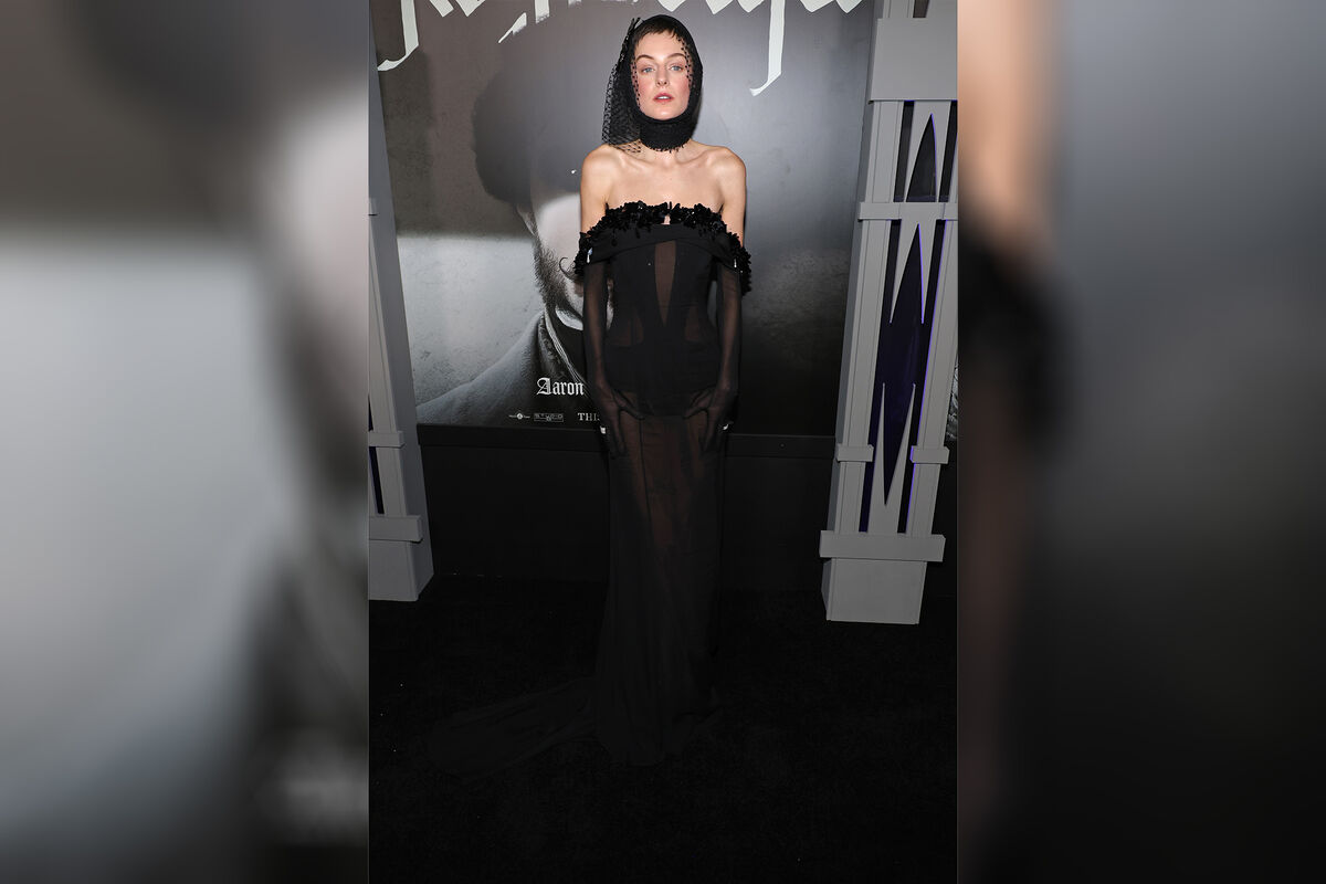 Эмма Коррин стала гостьей премьеры фильма ужасов «Носферату». Для выхода на публику она предпочла полупрозрачное черное платье от бренда Miu Miu, которое дополнила необычным головным убором.