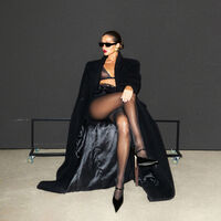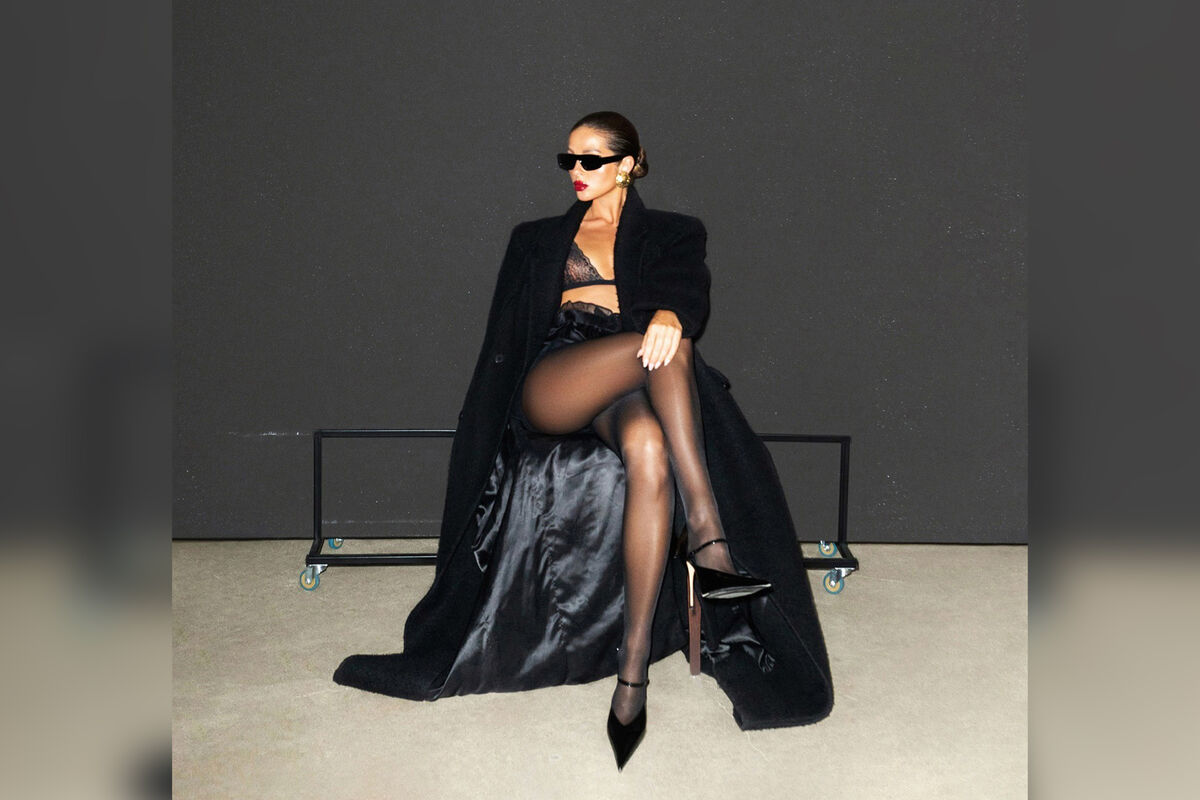34-летняя Нюша позировала в черном кружевном бюстгальтере, коротких шортах, капроновых колготках, длинном пальто и туфлях на каблуках. Певица добавила к образу золотые массивные серьги и солнцезащитные очки. Артистка снялась с уложенными в пучок волосами и макияжем с красной помадой.
