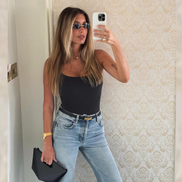 Кети Топурия позировала в синих облегающих джинсах и черном боди. Образ дополнила черная сумка из кожи, золотые часы, солнцезащитные очки и ремень с золотой пряжкой. Волосы она распустила и показала вечерний макияж.