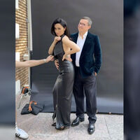 49-летняя Тина Канделаки позировала в сером струящемся платье с открытой спиной и высоким горлом. Образ дополнили туфли на высоких каблуках и с острым мысом. Волосы ей уложили мягкими прядями и сделали вечерний макияж. В кадре она позировала вместе с мужем Василием Бровко.