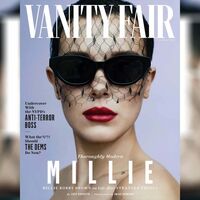 Перед камерой Милли Бобби Браун позировала в белом боди с глубоким декольте и чокере с изумрудом. Волосы ей уложили в низкий пучок и сделали макияж с вишневой помадой. А на обложке она позировала в солнцезащитных очках и черной вуали.