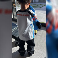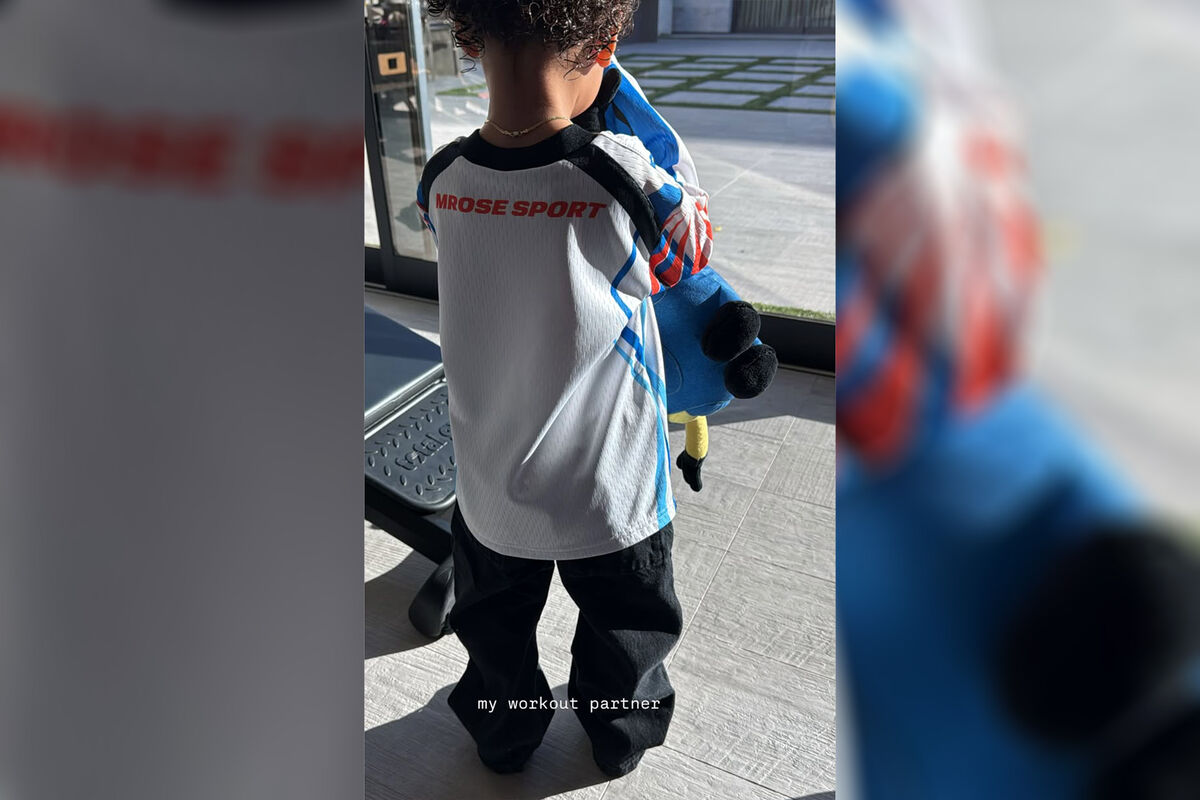 Кайли Дженнер показала, как мальчик в спортивной футболке с номером и черных брюках смотрел на внутренний двор через панорамное окно. В руках Эйр держал игрушку.