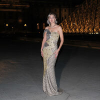 Джиджи Хадид стала гостьей гала-ужина в Лувре, который прошел 4 марта в рамках Недели моды в Париже. Модель позировала перед фотографами с новым серебристым цветом волос. Стилисты сделали ей укладку в ретро-стиле, а визажисты — макияж с блестящими тенями и розовой помадой. Манекенщица предпочла для закрытого мероприятия серебристо-золотое платье из страз, сшитое из трех нарядов Moschino. Бизнесвумен также надела ожерелья, массивные серьги, браслет и несколько колец.