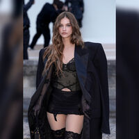 31-летняя Барбара Палвин посетила показ бренда Balenciaga, который прошел 9 марта в рамках Недели моды в Париже. Модель позировала перед фотографами в черном наряде, состоящем из кружевного корсета, микроюбки, длинного пальто, чулок, длинных перчаток и ботильонов на каблуках. Манекенщице сделали макияж с угольно-черными стрелками и нюдовыми губами, а также уложили волосы в локоны.
