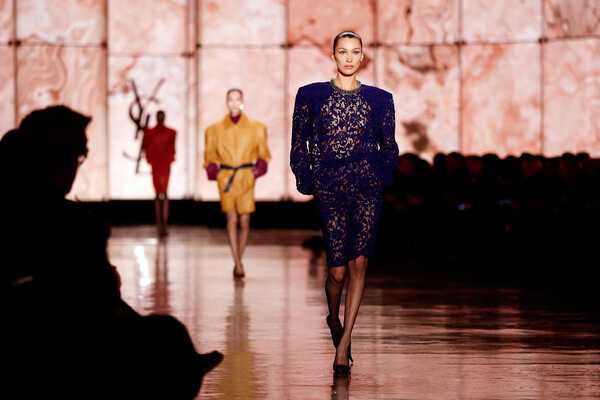 28-летняя Белла Хадид приняла участие в показе бренда Saint Laurent, который прошел 11 марта на Неделе моды в Париже. Супермодель дефилировала на подиуме в абсолютно прозрачном фиолетовом платье из кружева с подплечниками и массивным серебристым украшением. Бизнесвумен также надела колготки и черные остроносые туфли на каблуках. Манекенщице уложили волосы в гладкий пучок и сделали макияж с угольно-черными стрелками и нюдовыми губами.