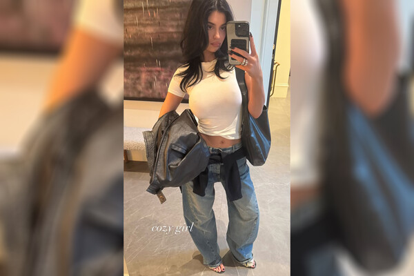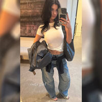 Кайли Дженнер вышла на публику в белом топе без белья и спущенных широких джинсах. Волосы она распустила и сделала вечерний макияж с шоколадной помадой. Образ завершила сумка из кожи на плече, босоножки и черный лонгслив вместо пояса на брюках.