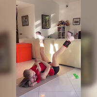 Юлианна Караулова сфотографировалась в черных велосипедках и спортивном топе. Образ дополнили кроссовки и грузы на ногах. Выполняя упражнения для ног, она положила сына на живот.