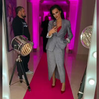 44-летняя Слава стала гостьей pre-party премии телеканала RU.TV, которое прошло 9 апреля в Москве. Поп-исполнительница выбрала для светского мероприятия серый костюм, состоящий из жакета и юбки с разрезом. Певица добавила к образу красный корсетный топ с декольте и лаковые бордовые туфли на каблуках. Визажист сделал знаменитости макияж с тенями, контурингом и коричневым блеском для губ, а стилист уложил волосы.