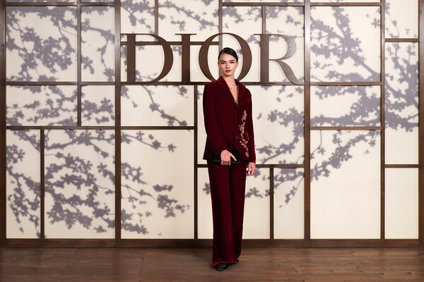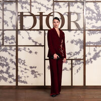 20-летняя Дева Кассель стала гостьей показа новой коллекции Дома моды Dior, который состоялся в Киото. На светском мероприятии актрису сопровождал ее возлюбленный Сол Нанни. Дочь Моники Беллуччи и Венсана Касселя позировала перед фотографами в бордовом бархатном жакете с декольте и вышивкой без бюстгальтера, широких брюках и черных туфлях. Знаменитости уложили волосы в гладкий низкий пучок и сделали макияж с черными стрелками и персиковой помадой.