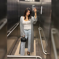 Виктория Антонова стояла перед зеркалом в лифте в белой облегающей майке, сером длинном кардигане, голубых джинсах и туфлях с заклепками. Жена Александра Петрова дополнила образ цепочкой с кулоном, черной кожаной сумкой Chanel и массивным кольцом. Девушка позировала с распущенными волосами и макияжем в естественном стиле.