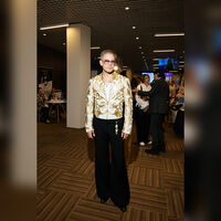 51-летний Митя Фомин позировал перед фотографами в белой куртке с золотистым узором, майке, черных брюках-клеш и туфлях. Певец дополнил образ очками в ретро-стиле, брелком и кольцами.
