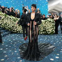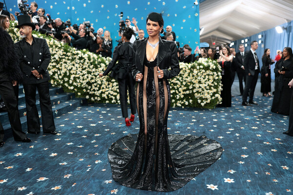 58-летняя Холли Берри посетила бал Met Gala, который состоялся 5 мая в Институте костюма Метрополитен-музея в Нью-Йорке. Голливудская актриса позировала на ковровой дорожке в черном прозрачном макси-платье в полоску от Лакуана Смита, украшенном пайетками. При этом артистка не стала надевать белье. Знаменитость добавила к образу укороченный жакет, босоножки на каблуках, шляпу, серьги, колье и кольца. Холли Берри уложили волосы и сделали макияж с коричневыми тенями, румянами и розовой помадой.