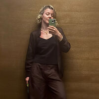 Юлианна Караулова позировала в коричневом трикотажном топе, льняных брюках и рубашке. Волосы она распустила и отказалась от макияжа.