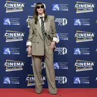 60-летняя Моника Беллуччи предпочла для выхода серый мужской костюм Saint Laurent, белую рубашку и зелено-синий галстук. Волосы ей выпрямили и сделали вечерний макияж. Образ дополнили солнцезащитные очки, часы и браслеты.
