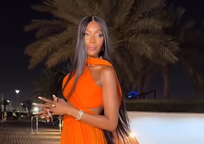 Наоми Кэмпбелл позировала в оранжевом платье из легкой ткани с голой спиной и открытыми руками. Волосы она распустила и сделала вечерний макияж. Модель посетила одно из мероприятий в Абу-Даби.