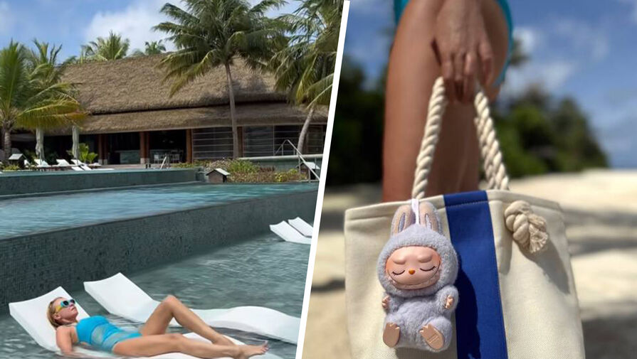 Яна Рудковская позировала в голубом купальнике с голой спиной. Образ дополнила пляжная сумка, к которой прикрепила брелок Labubu. Его стоимость составляет от 10 тысяч рублей.