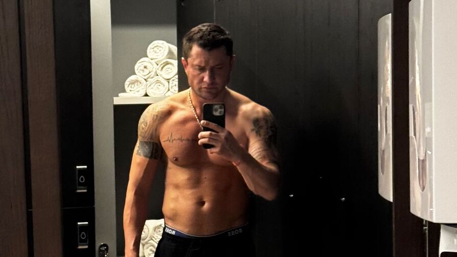 37-летний Павел Прилучный стоял перед зеркалом в спортзале с голым торсом. Актер был одет в черные треники и цепь.