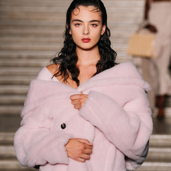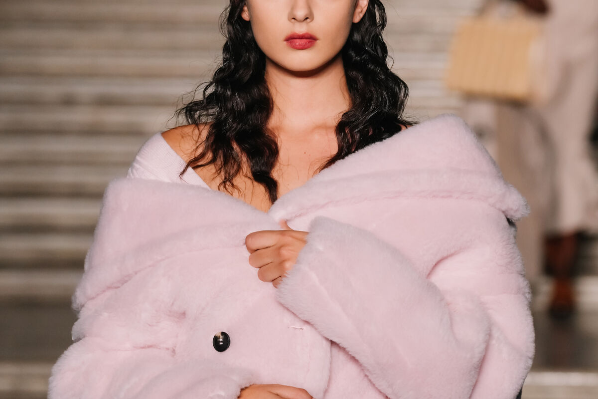 Дева Кассель появилась на подиуме в розовой шубе со спущенными плечами и коричневых ботинках. Волосы ей распустили и сделали макияж с розовыми тенями.