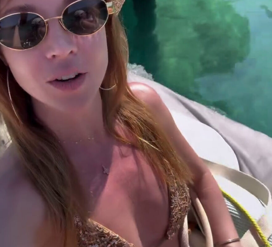 43-летняя Наталья Подольская была запечатлена в золотом лифе бикини в пайетках, который дополнила мини-юбкой в тон, соломенной шляпой, солнцезащитными очками, серьгами и сумкой. Поп-исполнительница позировала с распущенными волосами и макияжем в естественном стиле. Знаменитость сидела в лодке с подругами.