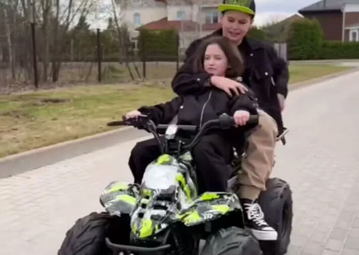 Жена Павла Прилучного засняла, как 9-летняя Мия катается на квадроцикле вместе с 12-летним братом Тимофеем загородом. Мальчик обнимает сестру, пока та сидит за рулем.
