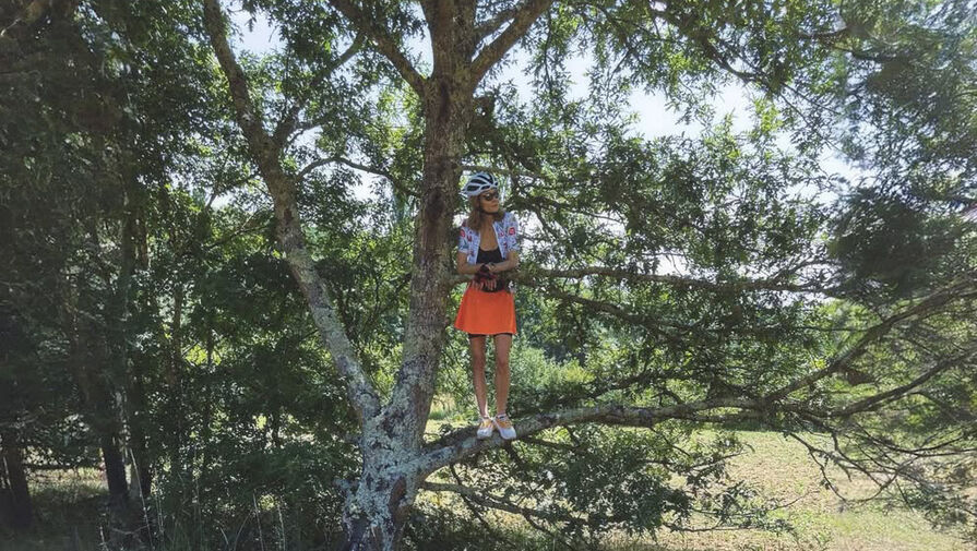 43-летняя Светлана Ходченкова предстала перед камерой в черном топе, поверх которого надела белую рубашку с принтом. Актриса добавила к образу оранжевую мини-юбку, шорты, кроссовки, перчатки, шлем и солнцезащитные очки. Знаменитость позировала с распущенными волосами, стоя на ветке дерева. Снимки были сделаны во время поездки артистки на велосипеде по Италии.