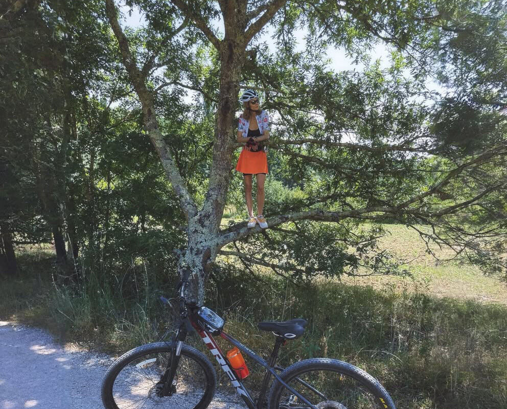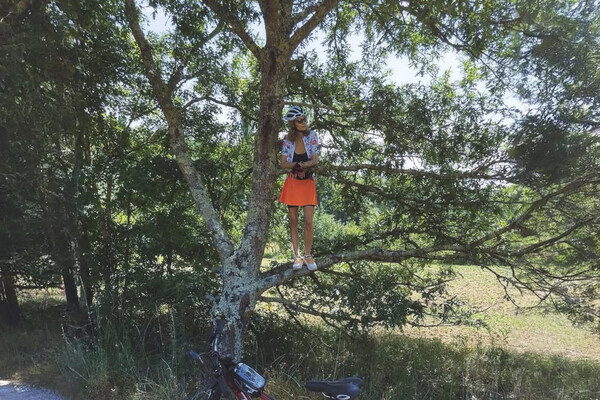 43-летняя Светлана Ходченкова предстала перед камерой в черном топе, поверх которого надела белую рубашку с принтом. Актриса добавила к образу оранжевую мини-юбку, шорты, кроссовки, перчатки, шлем и солнцезащитные очки. Знаменитость позировала с распущенными волосами, стоя на ветке дерева. Снимки были сделаны во время поездки артистки на велосипеде по Италии.