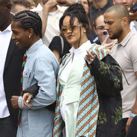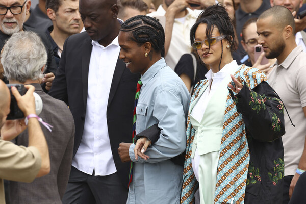 Певица Рианна пришла на показ бренда Dior в прямых серых брюках, белой облегающей блузе, зеленой рубашке и пестрой накидке. Волосы она собрала в высокий пучок и сделала вечерний макияж. Рианна появилась под руку с рэпером A$AP Rocky.