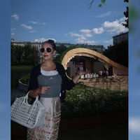 Ксения Собчак появилась в кремовой юбке со стразами, серой майке и белом топе и черном кардигане. Образ дополнили солнцезащитные очки и белая сумка-корзинка от бренда MiuMiu. Волосы она собрала в пучок и сделала макияж с шоколадной помадой.