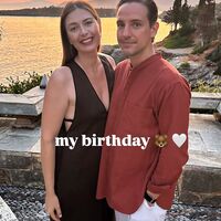 Мария Шарапова публично поздравила своего жениха с днем рождения. 38-летняя теннисистка позировала в черном макси-платье с глубоким декольте и вырезами по бокам и коричневых сандалиях. Спортсменка распустила волосы и сделала макияж в естественном стиле. 46-летний миллионер стоял в кирпичной рубашке, белых брюках и сандалиях.