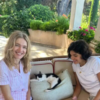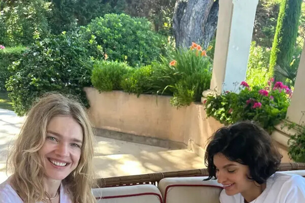 43-летняя Наталья Водянова была запечатлена в бело-розовом полосатом костюме, который состоял из рубашки с короткими рукавами и шортов. Супермодель также надела ожерелье, золотой браслет и кольца. Звезда подиумов позировала с распущенными волосами и без косметики. Манекенщица сидела на диване вместе с подругой рядом с котенком.