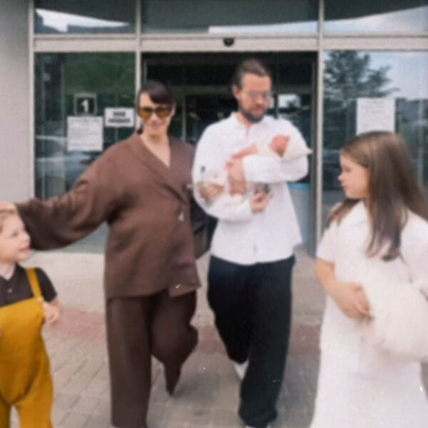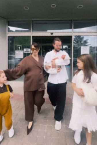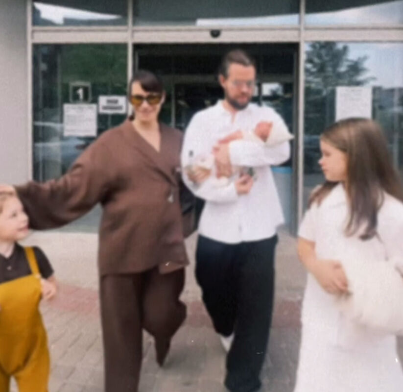 Ида Галич опубликовала видео, снятое во время ее выписки из роддома. В ролике телеведущая предстала в свободном шоколадном костюме, состоящем из рубашки и брюк. Рядом с ней шел ее сын Леон, жених Олег Ледвич с новорожденным ребенком и его дочь Анна.