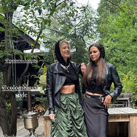 37-летняя Софья Эрнст позировала в укороченном черном топе, кожаной косухе, присборенной зеленой юбке и туфлях с носками. Волосы она собрала в пучок и отказалась от макияжа. Вместе с ней на прогулке позировала ее подруга.