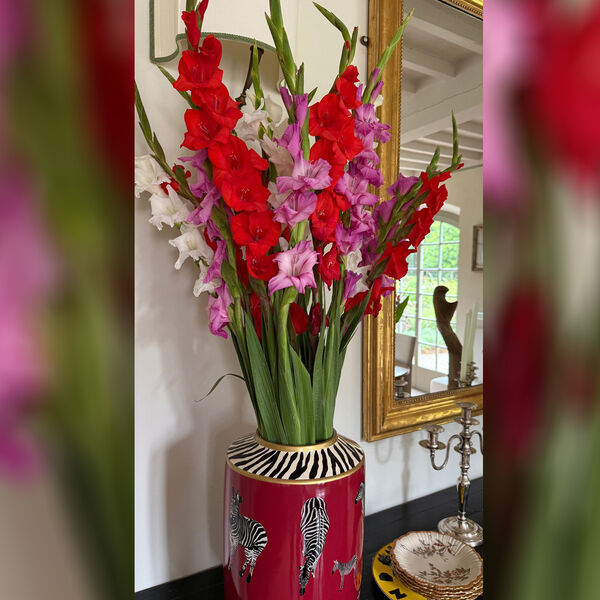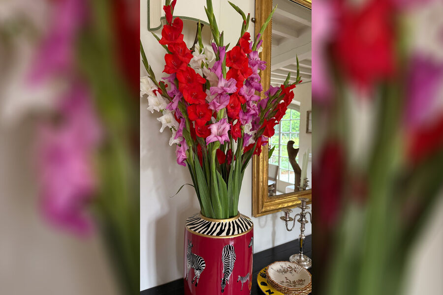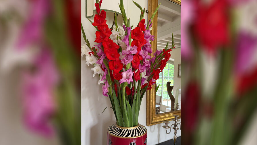 Юлия Высоцкая показала фрагмент зала с панорамным окном, из которого открывался вид на сад. На столике у зеркала в золотой раме стояла винтажная ваза в японском стиле с букетом гладиолусов, тарелки и блюдца и подсвечник.