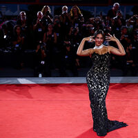 31-летняя Джорджина Родригес появилась на красной дорожке Венецианского кинофестиваля. Девушка выбрала для светского мероприятия черное кружевное платье с декольте, которое дополнила массивным колье и кольцами с бриллиантами, среди которых было украшение в 30 каратов. Знаменитости уложили волосы в пучок с прядями у лица и сделали макияж с черными стрелками и розовыми губами.