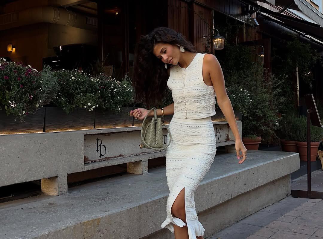 24-летняя Виктория Антонова позировала в белом укороченном топе и юбке-карандаше с разрезом. Образ дополнили мюли и сумка из кожи.