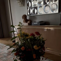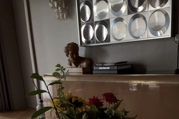 Ксения Собчак показала панорамную спальню, где у стены поставлен комод, а на стенах висят работы современных художников. Она также показала детали по дизайну: ковер с геометрическим принтом, торшер, вазы и скульптуру.