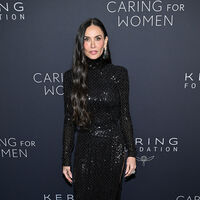 62-летняя Деми Мур вышла на публику в облегающем черном платье с разрезом до бедра и высоким горлом. Образ дополнили туфли на высоких каблуках и серьги с камнями. Волосы ей уложили мягкими локонами и сделали вечерний макияж с угольно-черными стрелками.